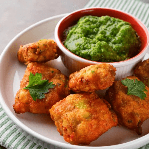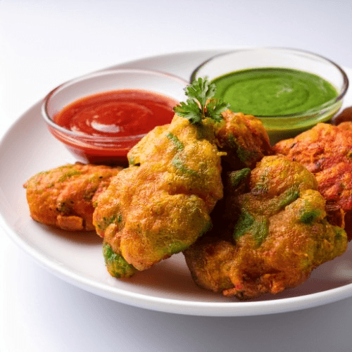 Delicious mixed vegetable fritters, lightly spiced and deep-fried to perfection, served with mint chutney. Vegan, Vegetarian, Gluten Free