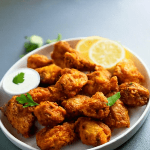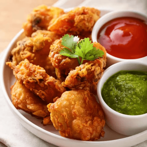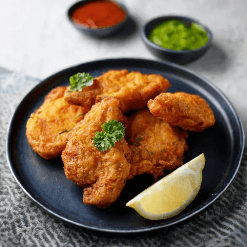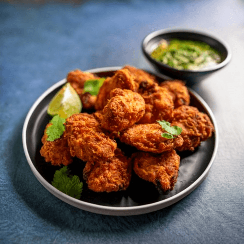 Chicken pieces marinated in a blend of spices, coated in chickpea flour, and fried to perfection, served with a side of tangy mint chutney and tamarind chutney. Gluten-free.