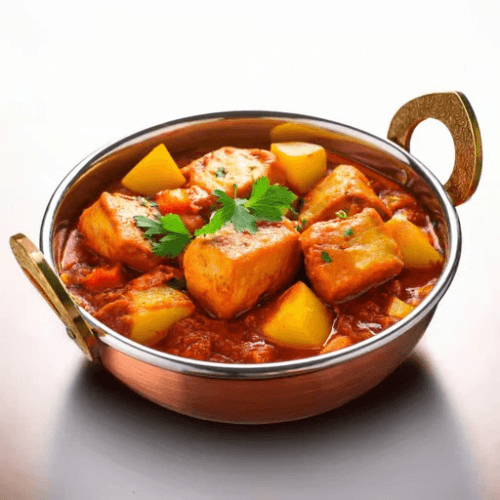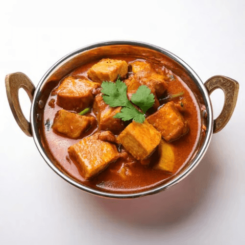 A rustic and robust dish featuring paneer cubes cooked in a thick, spicy tomato gravy with a special kadai masala and mixed bell peppers, offering a bold and authentic taste. Vegetarian, Gluten Free