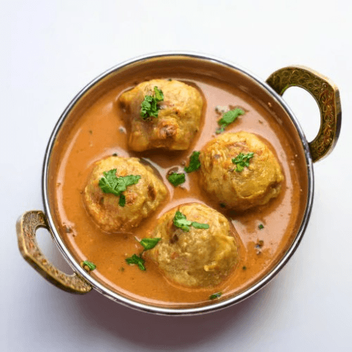 Soft and creamy dumplings made from mashed potatoes and paneer, stuffed with raisins and nuts, cooked in a rich, velvety tomato and cream sauce, garnished with a sprinkle of fresh coriander and a drizzle of cream. Vegetarian, Gluten Free, Nuts In