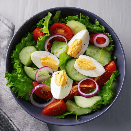 Egg cooked served over lettuce, tomato, cucumber, onions, and ranch on the side. Gluten-Free. Gluten Free