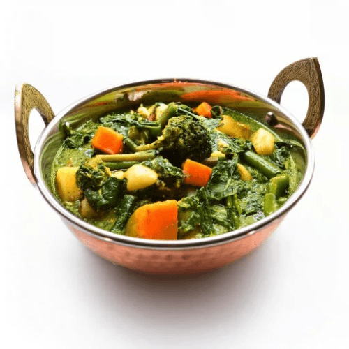 A nutritious and flavorful blend of mixed vegetables and spinach cooked in a mildly spiced sauce, providing a delightful balance of textures and flavors, garnished with a touch of cream. Vegan, Vegetarian, Gluten Free