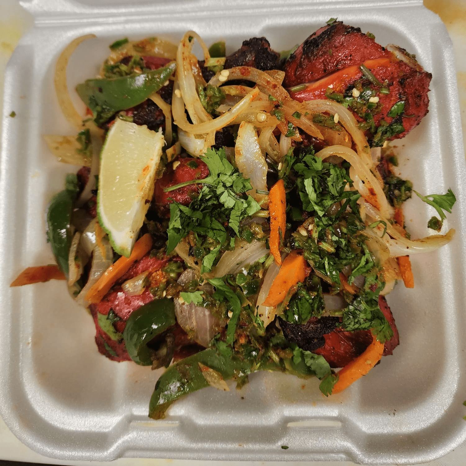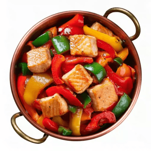 A vibrant and spicy dish featuring tender pieces of lamb stir-fried with bell peppers, onions, and tomatoes in a tangy and spicy sauce. A perfect balance of heat and flavor. Gluten Free