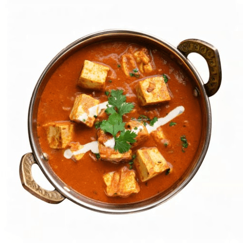 A classic Indian dish featuring tender pieces of paneer cooked in a buttery, smooth tomato sauce with a touch of cream and aromatic spices, garnished with a drizzle of fresh cream. Vegetarian, Gluten Free, Nuts In Vegetarian, Gluten Free, Nuts In