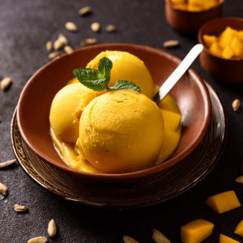 A smooth and creamy Indian ice cream made from reduced milk and fresh mango pulp, offering a tropical and refreshing flavor, garnished with mango chunks or a sprinkle of nuts. Vegetarian