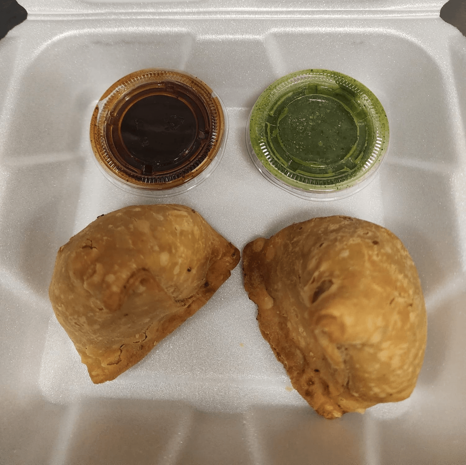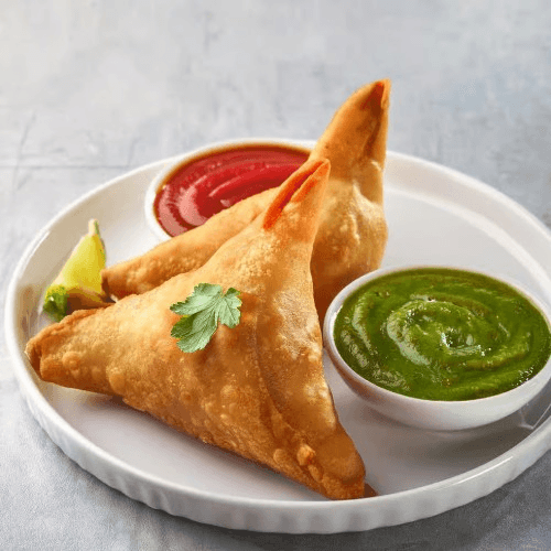 Crispy, golden pastry pockets filled with a savory blend of spiced potatoes, peas, and herbs, served with tamarind and mint chutney. Vegan and vegetarian.