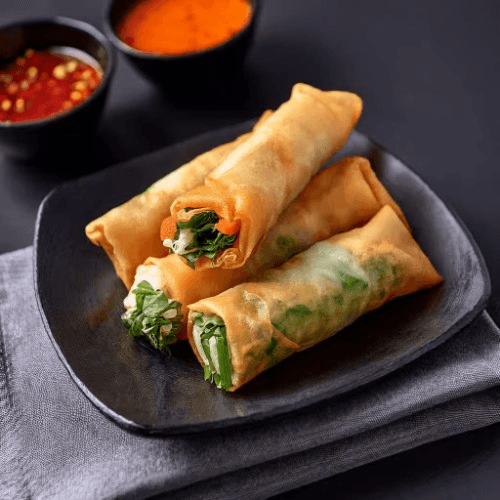 Mixed vegetables wrapped in rice crepes deep-fried. Vegan, Vegetarian
