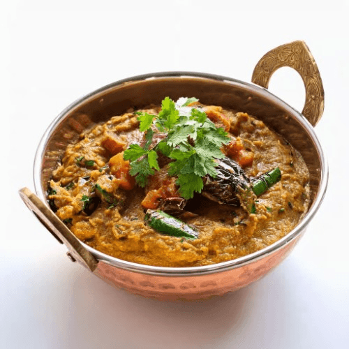A smoky and flavourful dish made from roasted eggplant mashed and cooked with onions, tomatoes, and spices, offering a rich and aromatic taste. Vegan, Vegetarian, Gluten Free