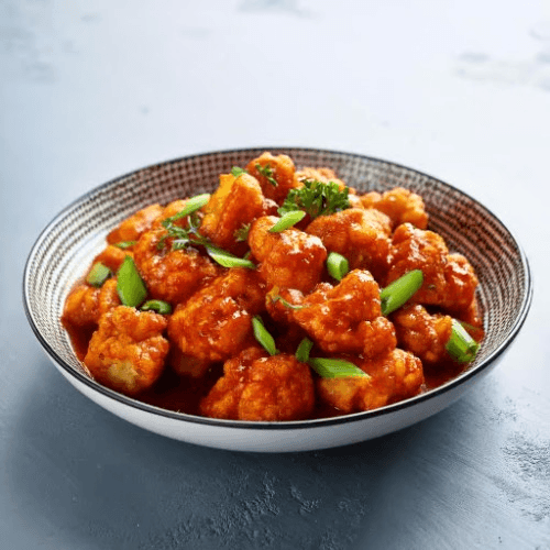 Crispy fried cauliflower tossed in a tangy and spicy Manchurian sauce, garnished with spring onions. Vegan, Vegetarian