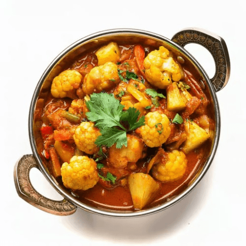 A popular Indian dish featuring tender cauliflower florets and potatoes cooked in a spiced tomato and onion gravy, finished with a sprinkle of fresh coriander and a squeeze of lemon. Vegan, Vegetarian, Gluten Free