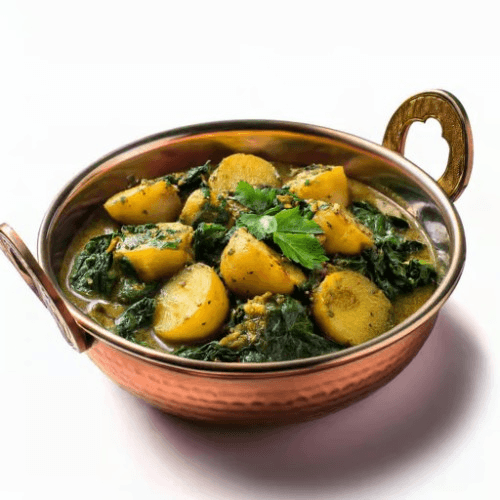 A comforting dish of soft potatoes cooked with spinach in a lightly spiced sauce, combining the earthiness of potatoes with the freshness of spinach, garnished with a sprinkle of cumin. Vegan, Vegetarian, Gluten Free