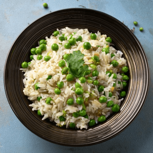 Fragrant basmati rice is cooked with sweet green peas, spices, and herbs, offering a simple yet flavorful dish that complements any curry. Vegetarian, Gluten Free, Nuts In