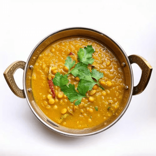 A comforting and classic Indian lentil dish, cooked with a blend of yellow lentils and tempered with a mix of spices, garlic, and cumin seeds, finished with a splash of ghee and garnished with fresh coriander. Vegan, Vegetarian, Gluten Free