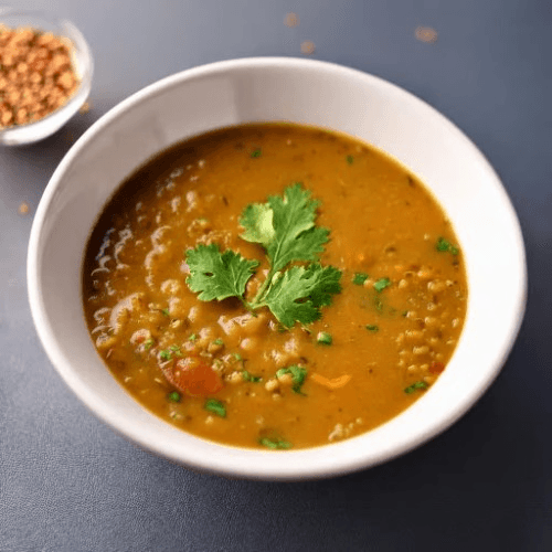 A hearty and nourishing soup made from slow-cooked lentils, infused with aromatic spices and herbs, offering a rich, earthy flavor. Garnished with fresh coriander. Vegan, Vegetarian, Gluten Free