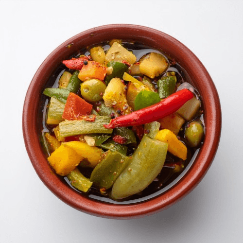 A tangy and spicy condiment made with a mix of vegetables and fruits pickled in a blend of aromatic spices and oil, adding a burst of flavor to any meal. Vegan, Vegetarian, Gluten Free