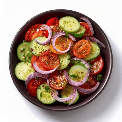 Indian-style lettuce, cucumber, tomato, red onion, green chili, and lemon. Vegan, Vegetarian, Gluten Free