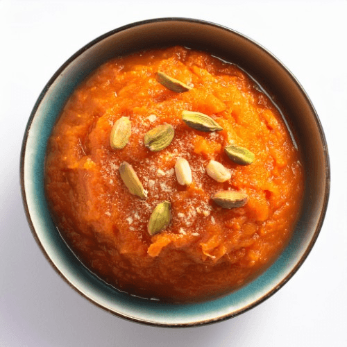 A rich and aromatic dessert made from grated carrots cooked in milk, ghee, and sugar, infused with cardamom, and garnished with a generous sprinkle of nuts, providing a warm and comforting treat. Vegetarian, Nuts In
