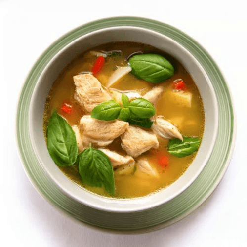 A light yet flavourful soup with tender chicken simmered in a fragrant broth of fresh basil, garlic, and vegetables. Enhanced with a touch of ginger for a refreshing and aromatic finish. Gluten Free