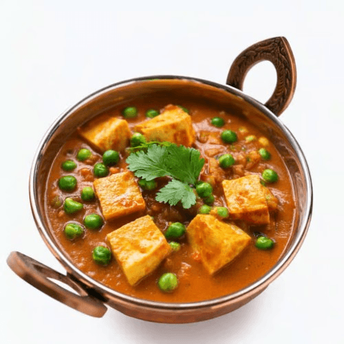 A popular North Indian dish made with tender paneer and sweet green peas simmered in a rich, aromatic tomato and onion gravy, garnished with a sprinkle of fresh coriander. Vegetarian, Gluten Free