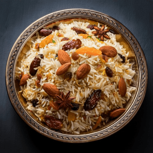 A luxurious and aromatic pulao made with basmati rice, a mix of dried fruits and nuts, and a touch of saffron, offering a sweet and savory taste experience. Vegetarian, Gluten Free, Nuts In