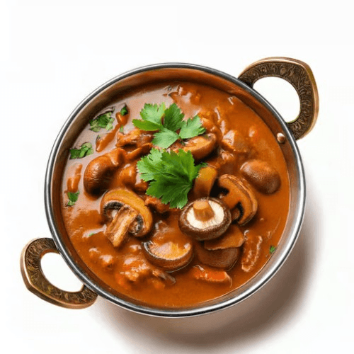 A savory and rich dish featuring tender mushrooms cooked in a spiced tomato and onion gravy, garnished with fresh coriander and a hint of cream. Vegan, Vegetarian, Gluten Free