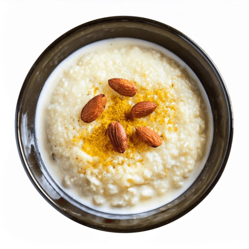 A traditional Indian rice pudding made by slow-cooking rice in milk with sugar, flavored with cardamom and saffron, and garnished with a sprinkle of chopped nuts and raisins, offering a creamy and indulgent dessert. Vegetarian, Nuts In