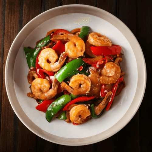 A popular Indo-Chinese dish featuring shrimp stir-fried with bell peppers, onions, and green chilies in a spicy soy-based sauce. Perfectly balanced with a hint of sweetness and tang